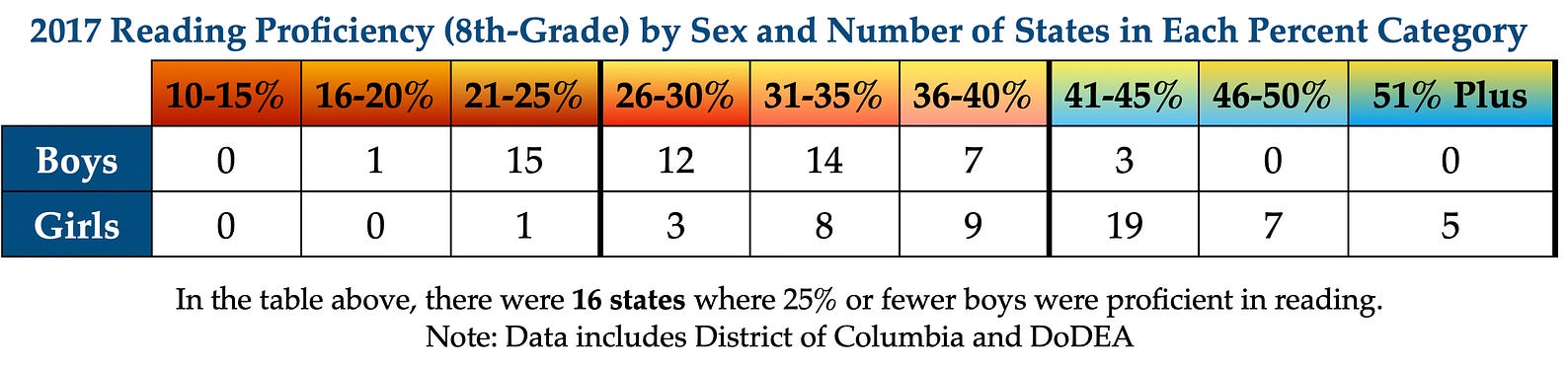 In 2017, boys where “Significantly Behind” or “Extremely Behind” girls in 47 states and the DoDEA in reading.