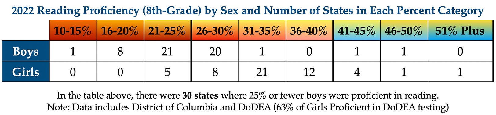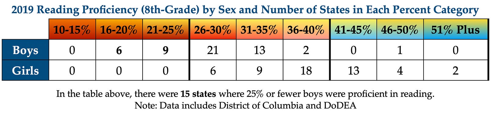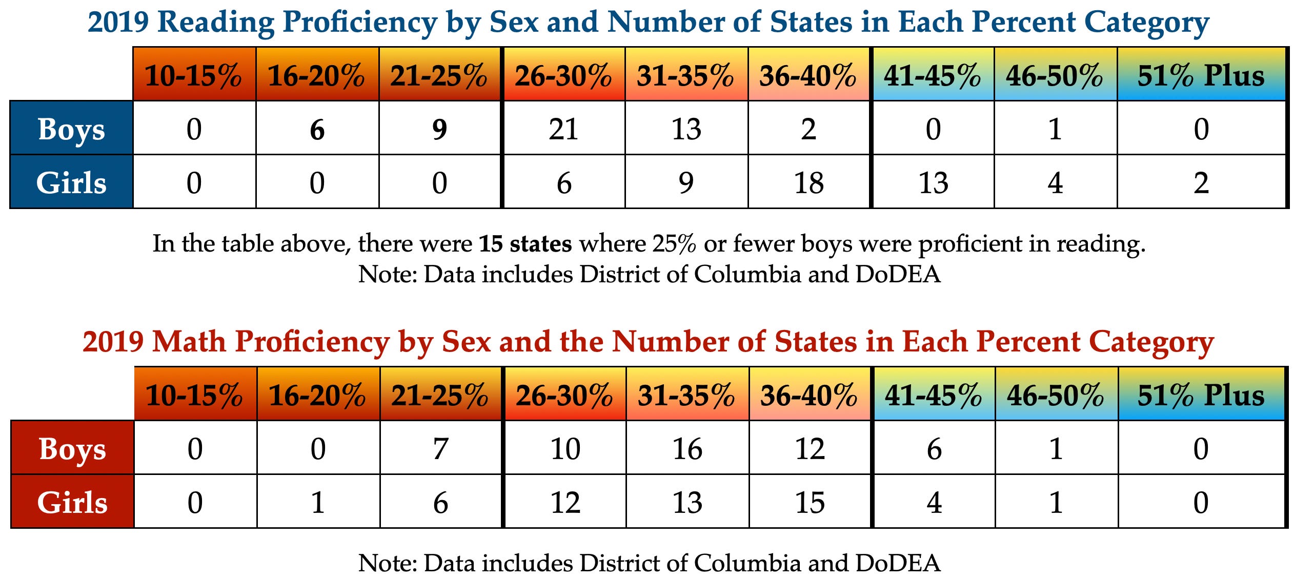 Reading is, unequivocally, the largest educational gap our nation faces, as boys are behind girls in essentially every state in the country by significant and extreme margins when it comes to being proficient or advanced (see tables in appendix).