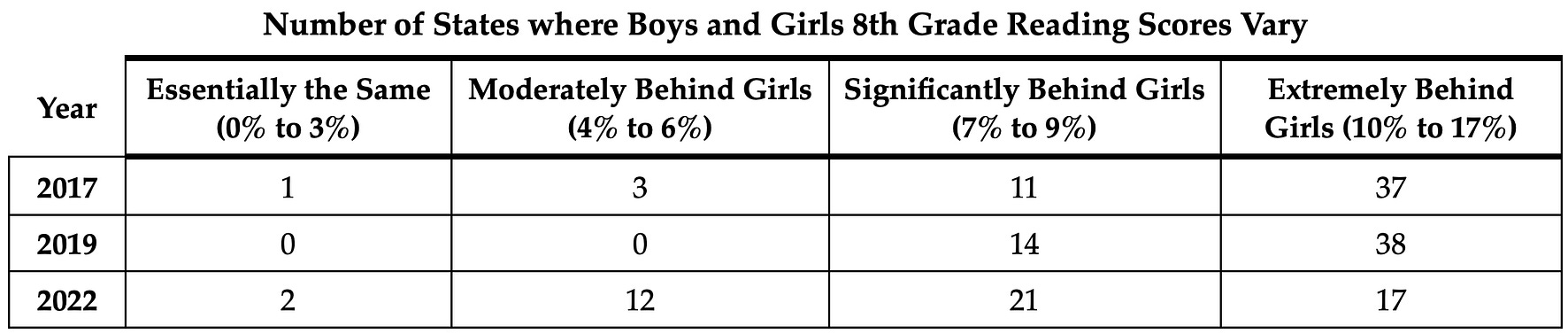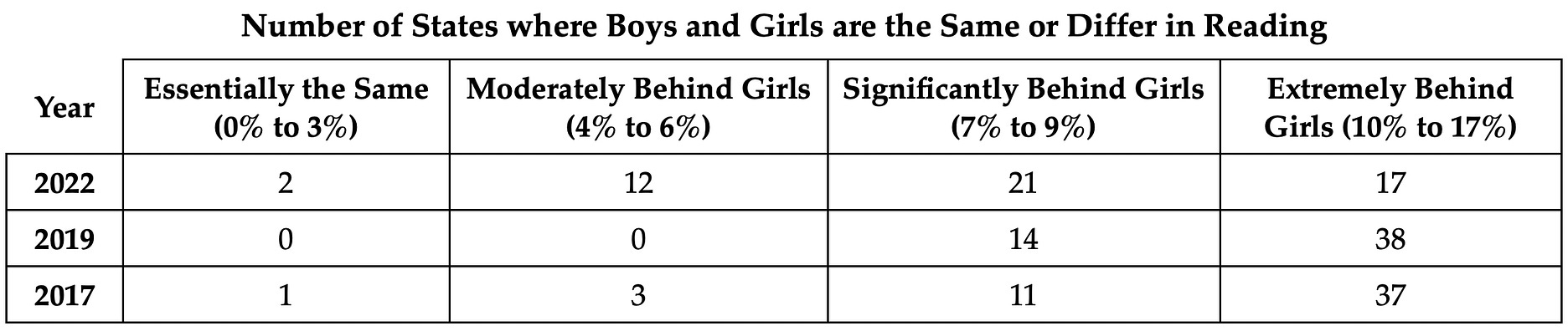 In 2022, boys where “Significantly Behind” or “Extremely Behind” girls in 36 states, the District of Columbia, and DoDEA.