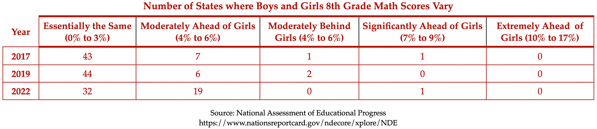 Although the girls reading scores dropped more than boys from 2019 to 2022, there scores were still higher, as boys fared worse in reading than girls by significant and extreme margins. And when it comes to math scores, there is essentially no difference in boys’ and girls’ outcomes.