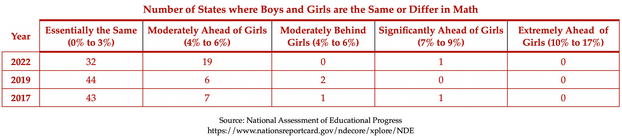 Any differences between boys and girls in math seems quite manageable when looking at the number of states where the percent difference between boys and girls is essentially the same or moderately different.